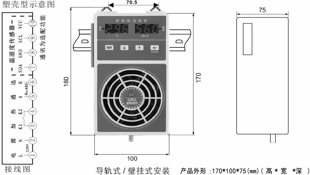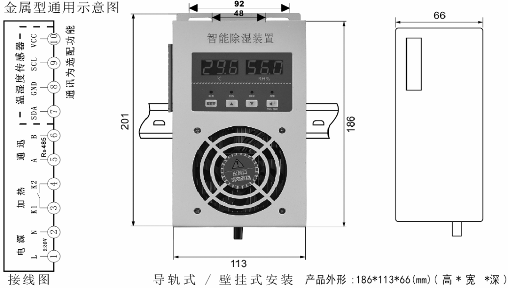 產(chǎn)品簡(jiǎn)介 / Introduction概述:智能型除濕裝置是采用半導(dǎo)體制冷除濕方式,主動(dòng)將密閉空間的潮濕空氣在風(fēng)扇的作用下吸入除濕風(fēng)道,空氣中的水汽經(jīng)過半導(dǎo)體制冷機(jī)構(gòu)后冷凝成水,再通過導(dǎo)水管排除柜體,可以達(dá)到很好的除濕效果。降溫型:當(dāng)F01設(shè)置0時(shí)為降溫型,當(dāng)環(huán)境濕度高于濕度最大值(濕度設(shè)定值)期間除濕裝置會(huì)自動(dòng)開啟除濕;當(dāng)環(huán)境濕度低于濕度最低值(濕度設(shè)定值減去濕度回差值)停止除濕。當(dāng)環(huán)境溫度高于設(shè)定溫度最高值(溫度設(shè)定值),風(fēng)扇散熱開始啟動(dòng),當(dāng)溫度低于設(shè)定溫度值(溫度設(shè)定值減去溫度回差值)降溫風(fēng)扇停止工作。升溫型:當(dāng)F01設(shè)置1時(shí)為升溫型,當(dāng)環(huán)境溫度低于設(shè)定溫度最低值(溫度設(shè)定值),加溫開始啟動(dòng),當(dāng)溫度高于最高溫度值(溫度設(shè)定值加上溫度回差值)加溫停止。如同時(shí)需冷凝除濕,設(shè)置濕度值,當(dāng)環(huán)境濕度高于設(shè)定濕度最大值(濕度設(shè)定值)期間除濕裝置會(huì)全自動(dòng)開啟除濕;當(dāng)環(huán)境濕度低于濕度最低值(濕度設(shè)定值減去濕度回差值)停止除濕;當(dāng)手動(dòng)開啟除濕功能時(shí),除濕裝置將一直保持除濕功能,直至手動(dòng)關(guān)閉除濕功能。防結(jié)霜結(jié)冰功能:實(shí)時(shí)監(jiān)測(cè)冷凝面工作面溫度,防止冷凝面溫度過低在除濕工作的時(shí)候結(jié)冰結(jié)霜,影響排水效果空氣循環(huán)功能:柜內(nèi)空氣靜止?fàn)顟B(tài)下各個(gè)部位的溫度不同濕度不同,除濕器提供柜內(nèi)空氣循環(huán)功能,使柜內(nèi)各個(gè)方位的溫度濕度更加平均,能更加有效的監(jiān)測(cè)柜內(nèi)空氣中的濕度和環(huán)境溫度。技術(shù)參數(shù):