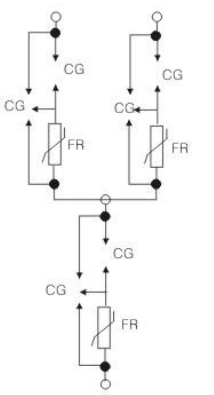 MREB系列浪涌保護器主放電電路由多個帶放電間隙和高能量的金屬氧化物非線性電阻的單元組成,100ka及以上的模塊在放電間隙/放電管串聯(lián)的基礎上并聯(lián)了放電間隙并增加了觸發(fā)電路。如圖所示:FR為氧化鋅非線性電阻,CG為放電間隙/放電管。